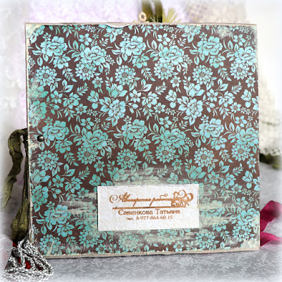 Затем приклеила все остальное. Чуть прошлась айвори-акрилом по цветам, лентам, краям бумаги. Открытка закрывается на ленту, посаженную на клей и закрепленную брадсами (если будете использовать, не забудьте вклеить ее и ножки брадсов между основами):