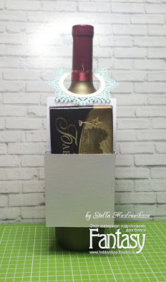 Далее готовим основу под шоколадку - лист плотной бумаги размером 18,5 х 9 см. Делаем биговку, отступая 1,5 см, отрезаем лишнее и приклеиваем нашу ажурную часть. К основе приклеиваем кармашек для шоколада.