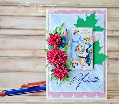На II этапе мы выбрали палитру поярче (№3) и сделали открытку для учителя. В работе использовали бумагу"Droga do Gwiazd" от Galeria Papierus. Также здесь - тематическая картинка, вырубка, карандаш и, конечно, цветы ручной работы.