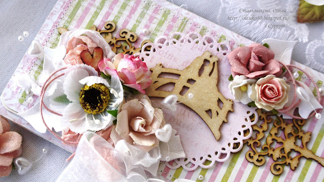 А ещё я в этот раз использовала эмбоссинг, нанесла на чипборд голографическую пудру и запекла, эффект меня очень порадовал... Чипборд стал выглядеть мерцающим! В оформлении ничего сложного - букетики из цветов, шебби-ленты, вощеный шнур, полужемчужинки (я люблю их использовать в свадебной теме, добавляют торжественности). В общем, всё просто...