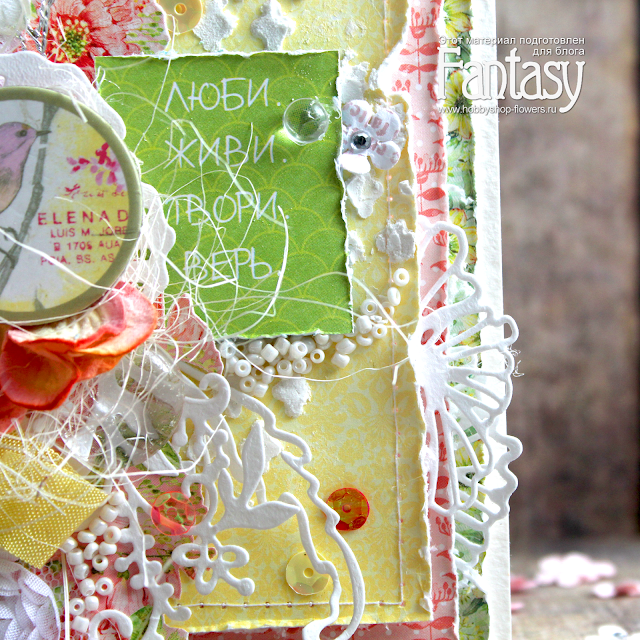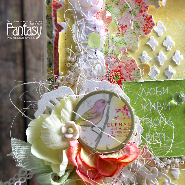Открытка получилась по-настоящему весенней. Легкость и ажурность я передала с помощью вырубки от ножей Fantasy: цветок "Скрап-Мак", цветок "Розалия 2", "Фантазия", "Ветка черемухи", "Жемчужные нити и тычинки для цветов".