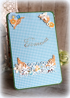 Открытка не просто декоративная - она с местом для надписи пожеланий и денежного подарка. На создание этой открытки вдохновили нас листочки от набора бумаги "Balonik dla siostrzyczki" отGaleria Papierus. Название бумаги означает "Шарик для сестрички". Также использовали вырубку, цветы, сизаль, машинную строчку, гипсовые фигурки (ангелочки), полужемчуг, пуговички.