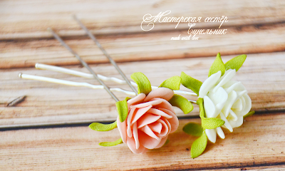 Совсем недавно мы вам показывали комплект из двух предметов - это были заколка-автомат и брошь. А сегодня мы вам готовы показать последний предмет этого комплекта. Это шпильки с ванильными и белыми розами.