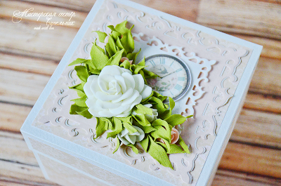 Крышку украсили цветочной композицией, на подложках вырезанных с помощью ножей (отлично подойдет набор ножей Spellbinders " Labels Forty-Two Decorative Elements ") Цветы выполнены из ревелюра (другие названия - фоамиран, искусственная замша). Центральная роза белого цвета, а бутоны ванильно-белые.