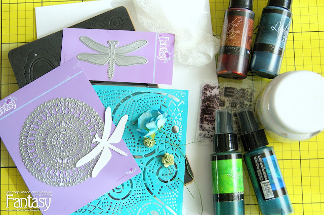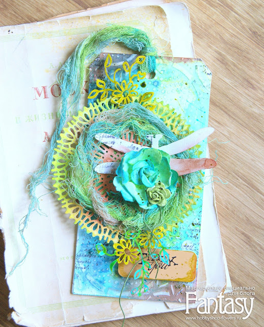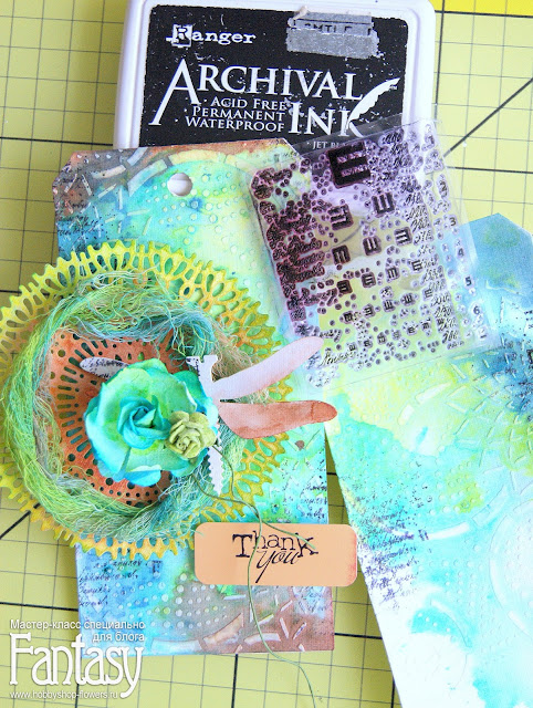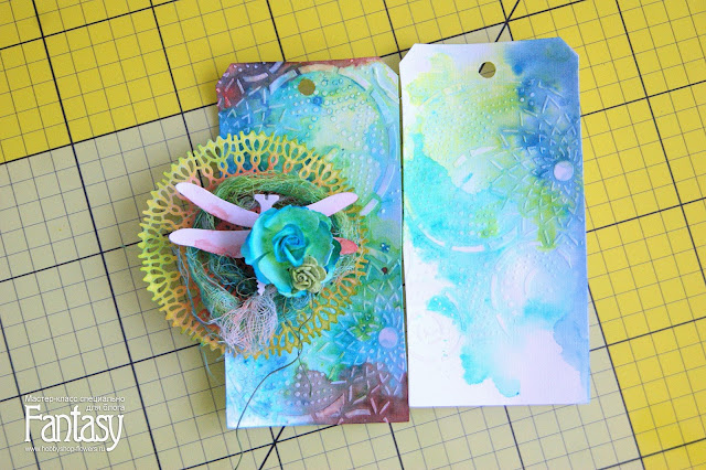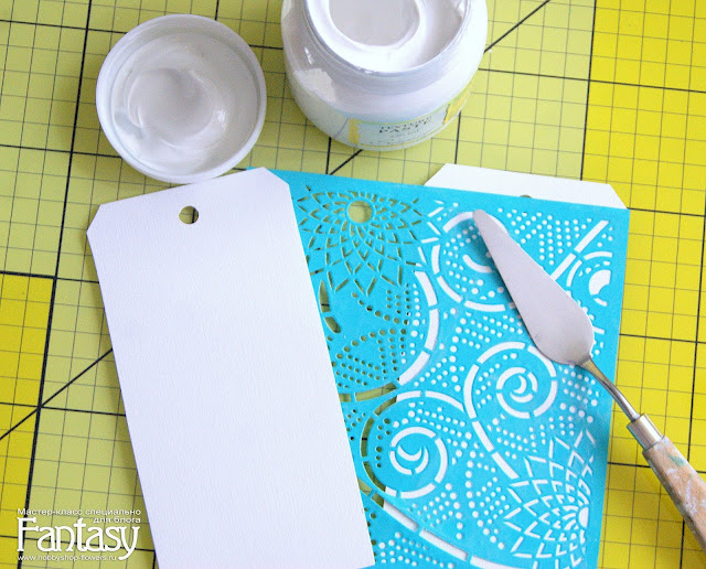 Наношу текстурную пасту через маску. На двух основах для тега.