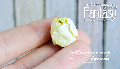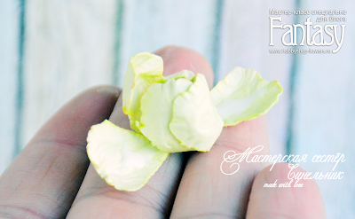 8. Берем зелено-желтую заготовку и помпончик. На детальке немного расправим лепестки.