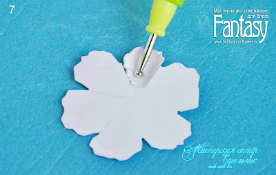 6. Берем 1 заготовку и при помощи бульки, тисним каждый лепесток на мягкой поверхности. Несколько раз проводим булькой (с нажимом) по краю лепестка (7).