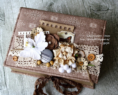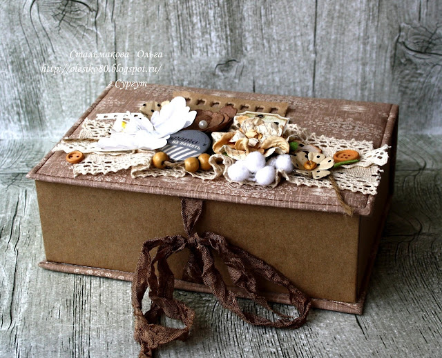 Коробочка получилась немного винтажная, на это меня подтолкнула крафт-бумага... В работе использовала уже полюбившиеся мне цветочки, пуговки, шебби ленты, бусинки, которые приобрела в этом году в Горном Алтае, фишки, кружево и чипборд.