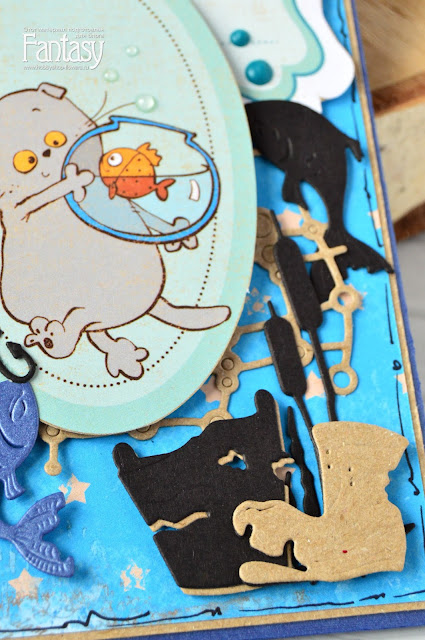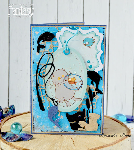 Меня часто просят сделать открытку - поздравление для мальчишки, и всегда выручает милый кот Басик. Получив посылку с новыми ножами от Fantasy, на волне вдохновения, сделала открытку и название придумалось сразу - "Кот-рыболов".