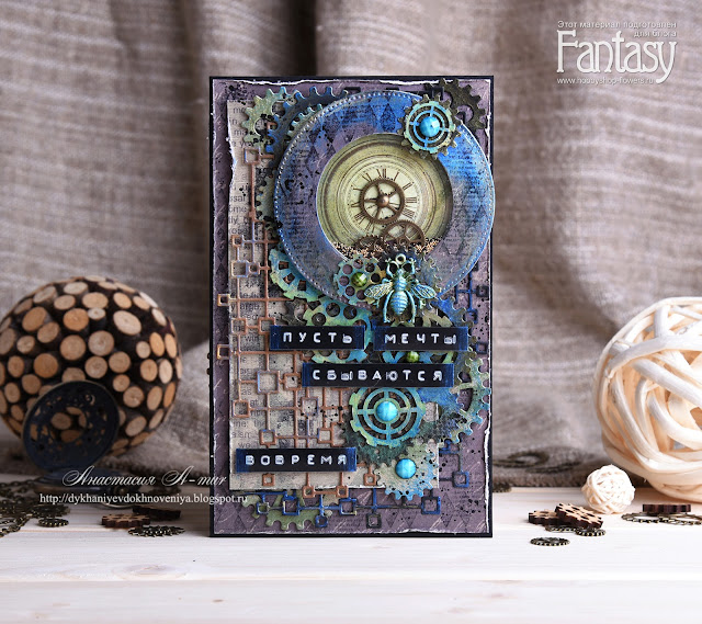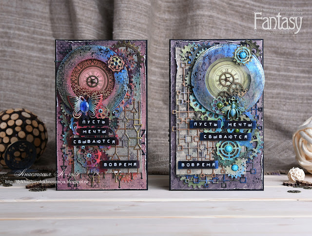 Для создания открыток я использовала скрап-бумагу из коллекции "Механические иллюзии"от ScrapBerry's, перламутровые акриловые краски от Таир, металлические шестеренки и шестеренки-чипборд, металиических бабочку и муху, граненые камушки и стразы, штампы, вырубку и надписи, сделанные с помощью ручного принтера.