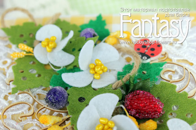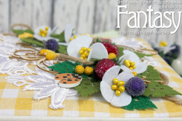 Коробочка тканевая, самодельная, украшена кружевом, ягодками, чипбордом, пуговками и вырубкой из фетра чудесными ножами FANTASY "Цветы пропелеры - 2" и Листья "Пузыри".