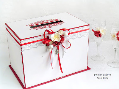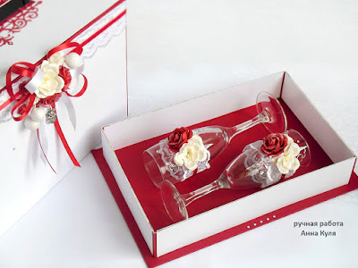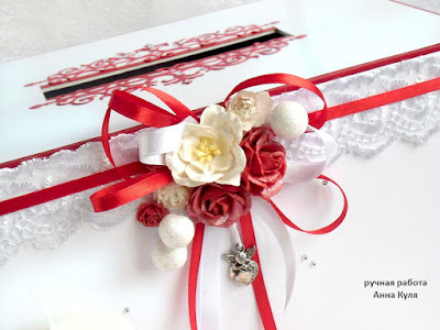 На украшение всех элементов использовала 9 красных розочек 4 см., 9 белых розочек 2 см., 9 красных розочек 1,5 см., 5 белых магнолий. Еще 4 метра недорогого кружева, 6 метров красной атласной ленты 1 см шириной, 2 метра белой атласной ленты 1,5-2 см. шириной и конечно стразы. Я люблю наборы Скрапберриз за соотношение цена/качество и разнообразие цветовой гаммы, а то, что в наборе идут камешки разного размера, вообще идеальный вариант.