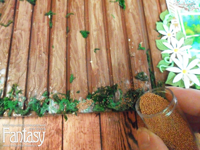 Далее начинаем декорировать обложку, я решила задекорировать искусственным мхом и микробисером. Промазываем клеем и хаотично раскладываем мох в тех местах, где вы хотите его видеть.