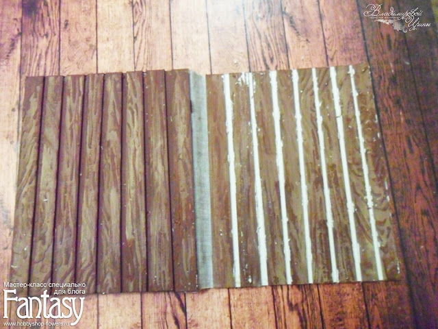 И начинаем приклеивать наши досочки на заготовку открытки с расстоянием тоже на ваше усмотрение.