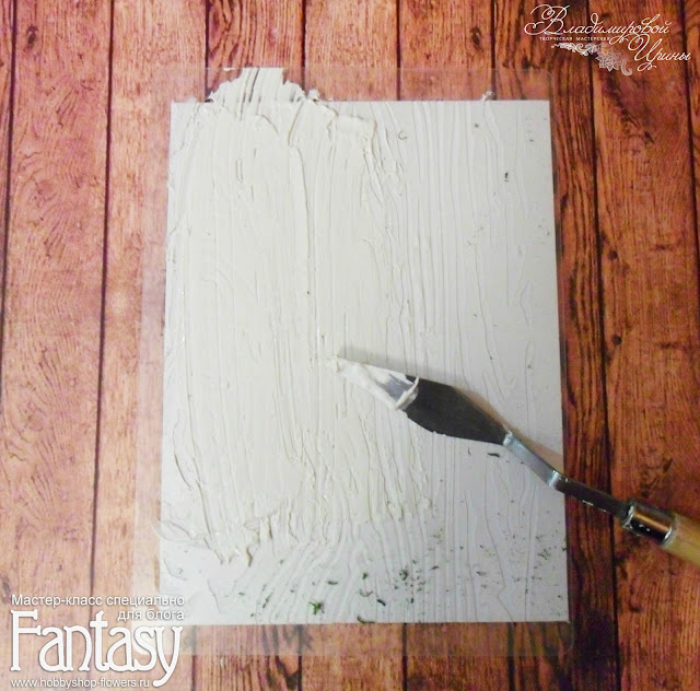 Далее берем заготовки поменьше, трафарет, текстурную пасту, мастихин, и наносим через трафарет рельеф.