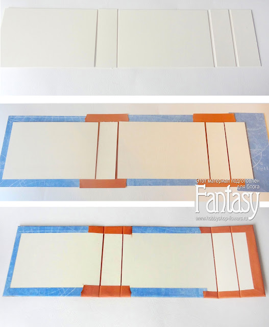 Всего у нас должно получиться 6 кармашков, которые мы поочередно склеиваем друг с другом (на оборотную сторону наносим двухсторонний скотч таким образом, как показано на фото) и получаем нашу "гармошку".