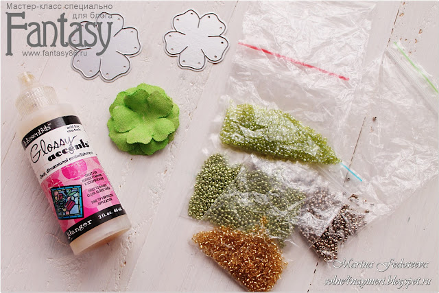 Подготавливаю материалы для сердцевины цветка. Я использую бисер, клею его на глосси-акцент.