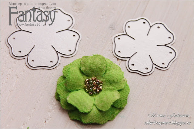 Беру ткань, в данном мастер-классе я использовала лён, и делаю вырубку с помощью ножей цветок "Роза". Для одного цветка я использовала 2 вырубки самым большим цветком и 1- средним.