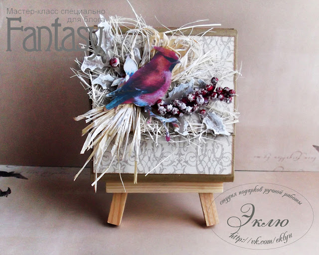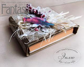 Начнем с того, что отрываем кусочек сизаля, точечно наносим клей и прикладываем к основе. Берем пару вырубных веточек падуба. Наносим клей ТОЛЬКО на основание веточки и приклеиваем. Немного отщипываем от моточка рафии, формируем снопик и клеим. Веточку бузины приклеиваем, располагая горизонтально. Вырезаем из бумаги птичку, приклеиваем на обратную сторону клеевые подушечки. Всю эту конструкцию клеим на обложку, аккуратно размещая подушечки между нитями рафии и сизаля (ВАЖНО! подушечки необходимо приклеить к основанию, а не к декору). Дополняем композицию полубусинам из набора "Элегия" и слегка проходим акриловой краской белого цвета от "Фабрики Декору".