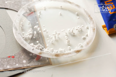 Теперь вставляем наш шейкер в подготовленное ранее окно основы открытки и приклеиваем.