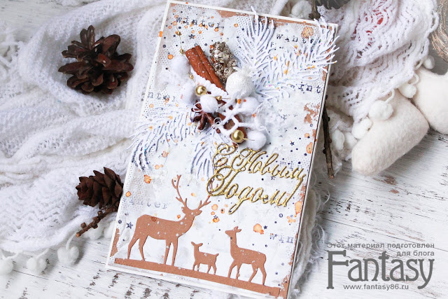 Работу украсила вырубка, сделанная ножами ТМ "Fantasy": "Еловая ветка + шишка", "Новогоднее украшение", листья "Огненного цветка"и чипборд "Fantasy""Новый год 128".