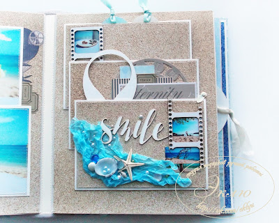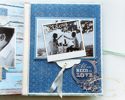 Для размещения фотографий на этой странице, мы использовали конструкцию "водопад", что позволило на одной странице разместить 6 фотографий формата 10*15 см. Под водопадом находится карман для дополнительных фотографий и тег для записей.