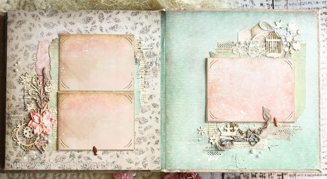 Выполнен из бумаги 7Dots Studio - я готова этой бумаге петь оду))) В качестве декора использовала большое количество чипборда, цветы лилии, веточки, шебби-ленты, полубусины, бисер, металлические элементы, брадсы, анкеры для подложек, штампы фоновые. В основе альбома - пивной картон.