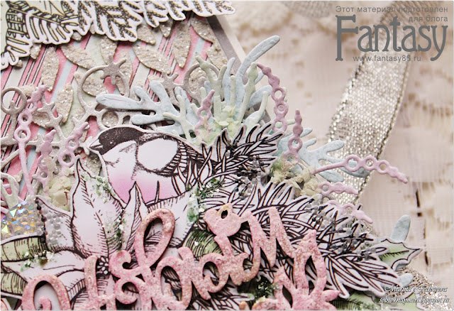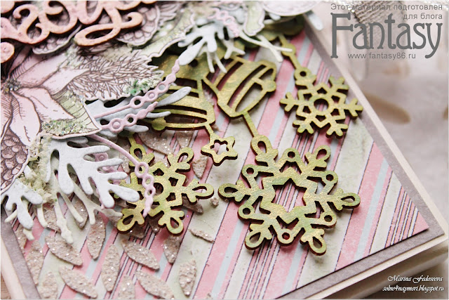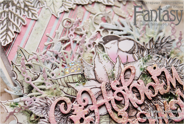 Чипборд-надпись "С новым годом" я покрыла в хаотичном порядке двумя разными пудрами для эмбоссинга и запекла. Результат получился очень интересным, как будто снежком припорошили)