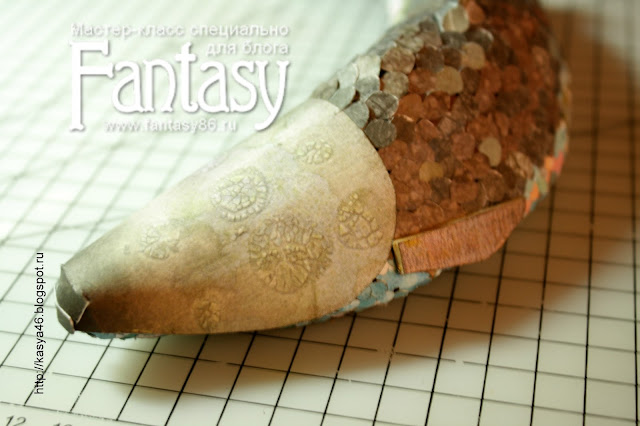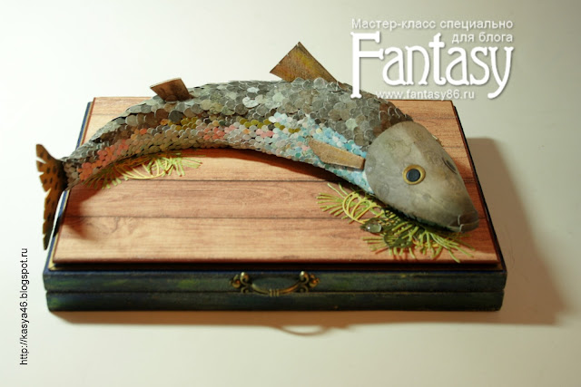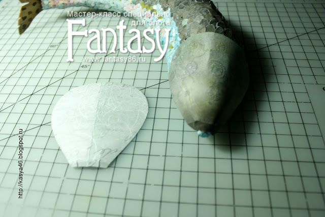 И с хвоста начинаю обклеивать заготовку. На хвосте и брюшке мелкие чешуйки, на спине - крупные. Самый низ рыбки не обклеиваю, т.к. она будет приклеена к "доске".