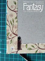 Теперь, приклеиваем скрап-бумагу с пришитой визитницей к заготовке. Сначала промазываем левую часть скрап-бумаги и заготовки и ровненько приклеиваем их друг к другу. При этом ниточки от шва мы заправляем вовнутрь, чтобы их не было видно)))