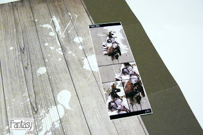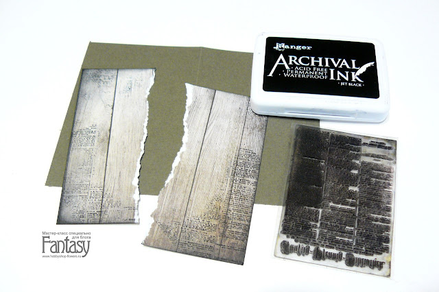 6. Тонирум края скрап-бумаги (рваный край я не тонирую) и штампуем фоновым штампом «газета», с этим штампом работаем именно на этом этапе. Взяла именно чёрный цвет, т. к. распечатка «паспорт» чёрного цвета и на иллюстрации тоже есть штрихи чёрного цвета. Слегка тонирую края иллюстрации и подложки для иллюстрации.