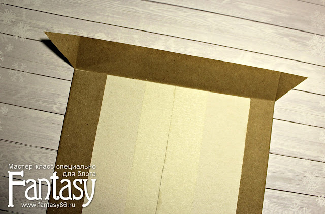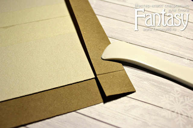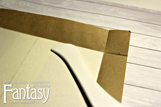 7) Начинаем формировать уголки. Загибаем со всех сторон крафт-бумагу, проглаживаем палочкой для биговки.