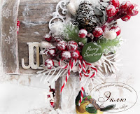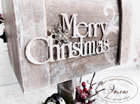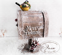 Детали почтового ящика поближе. Боковая часть ящичка украшена надписью из чипборда "Merry Christmas", покрытой глитером, и подвеской в форме снежинки. Дверцу ящика украшает венок из остролиста со звонкими колокольчиками и бубенцами)