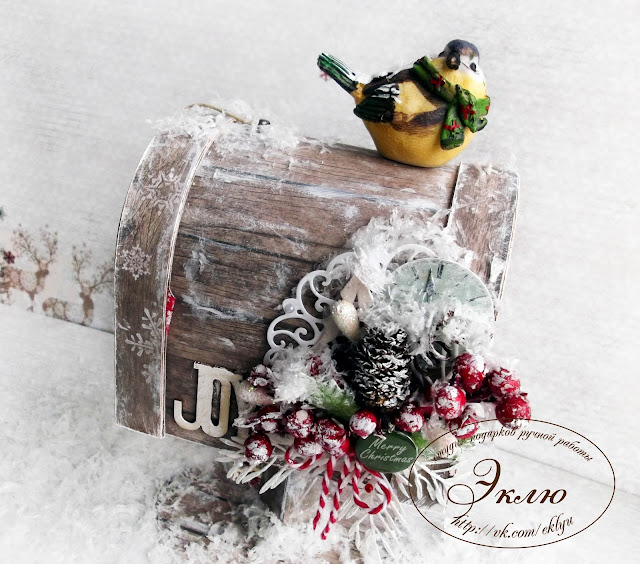 Ящик украшен композицией из заснеженных ягодок, шишек, еловых веточек, листиков остролиста.Композиция дополнена деревянной надписью и елочкой из чипборда.