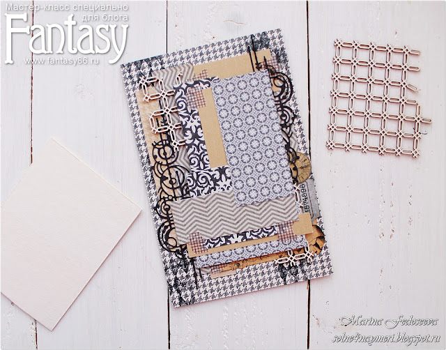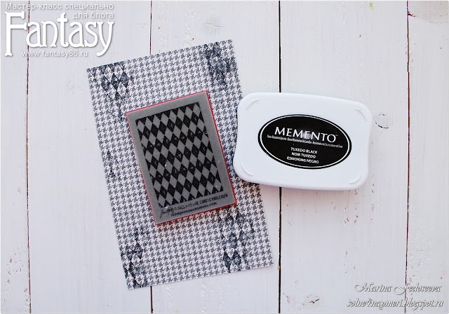 Из скрап-бумаги вырезаю заготовку размером 17,5 на 11,5. Усложняю фон с помощью штампа.