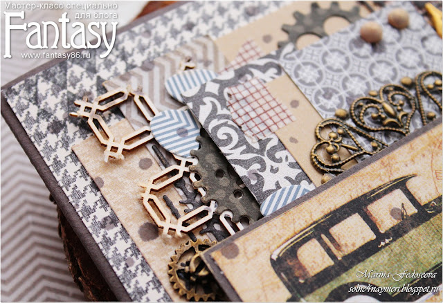 Начинаю приклеивать вырубку, чипборд и бумагу. Первый слой я приклеиваю на саму заготовку.