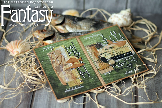 В работе я использовала ножи для вырубки Fantasy: "Набор рыбалка 1", "Улов рыбака", "Набор рыбалка 2" и фоновый "Решетка с треугольниками".