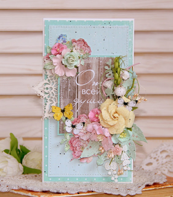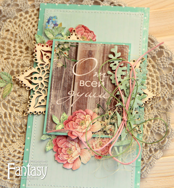 Делаем основу для открыточки размером 10 на 18 см. Вырезаем из скрап-бумаги два прямоугольника. Один меньше другого на 0,5 см. Для открыточки буду использовать карточку"От всей души!", для нее тоже сделала подложку.