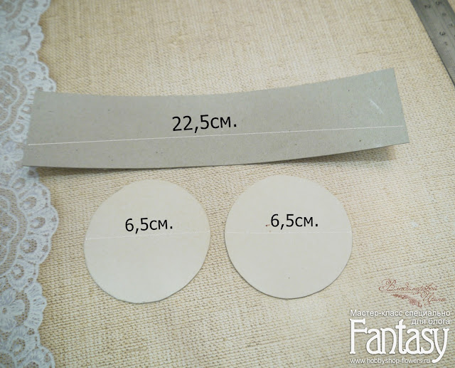 Далее берем окружность, у меня она 6,5 см. Вырезаем 2 шт. и полосочку длинной равной длине этой окружности, у меня 22,5 см.