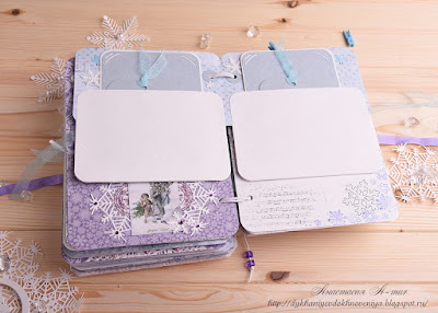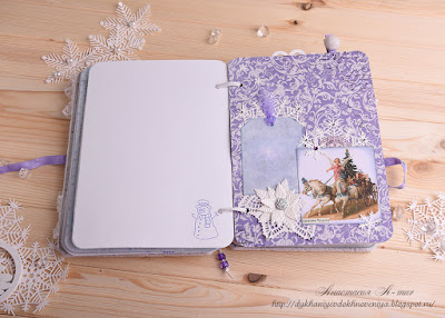 Дневник формата А5, очень вместительный и функциональный. В нем есть подложки для 42 фото размером 9х13см, кармашки, листы для записей и декоративные разделители. Для основы обложки я использовала пивной картон. Обложку обтянула тканью с эффектом стежки на синтепоне. И декорировала кружевом, жемчужной нитью, вырубкой, деревянным колокольчиком, который заэмбоссила белой пудрой. Ель так же покрыта белой пудрой. Завязывается блокнот на репсовую ленту.