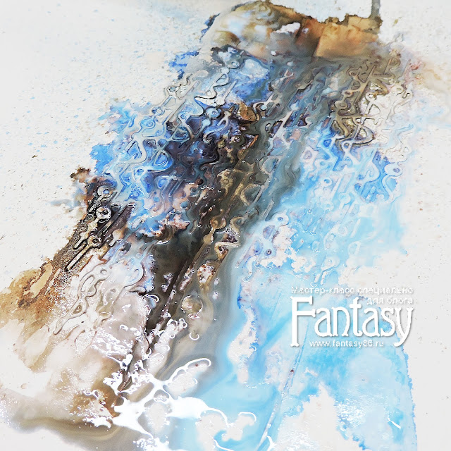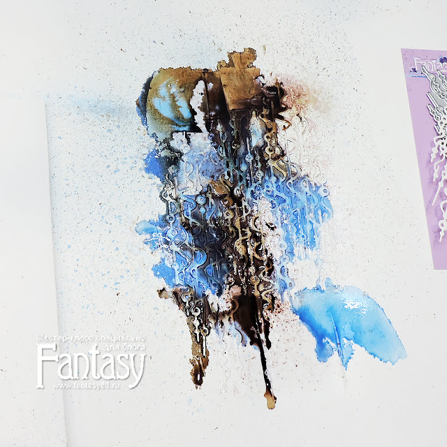После того как наша паста высохнет, можно наносить спреи. Пшикаем в некоторых местах синим и коричневым цветом, любуемся как перетекают цветные струйки)