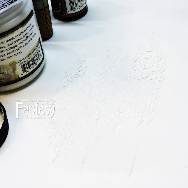 Затем неравномерно покрываю приклеенную вырубку прозрачной матовой текстурной пастой. Неравномерно, потому что хочется, что бы получился красивый рисунок красочных струек спреев: там, где паста есть, будет более гладкий красочный слой, там, где ее нет, краска впитается в бумагу.