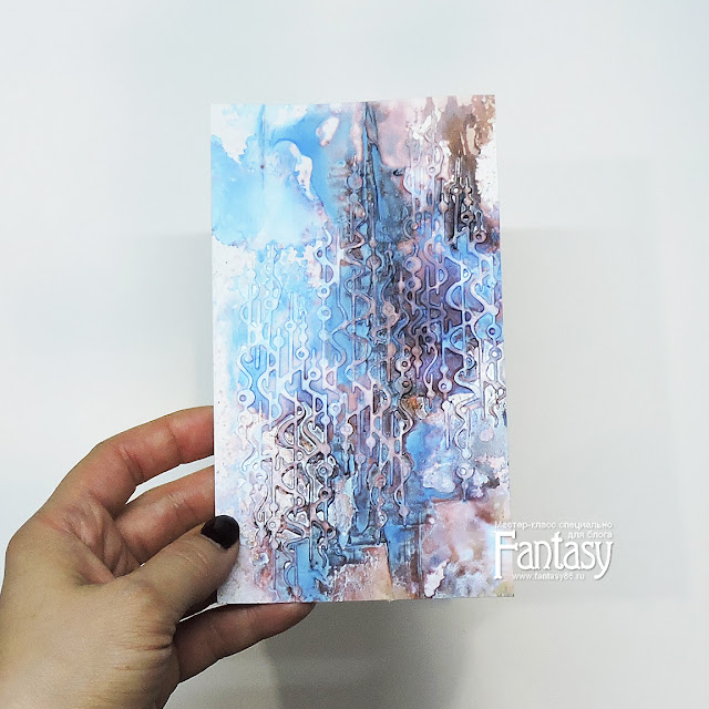 Мне показалось, что подобное сочетание слишком контрастно для белого фона акварельной бумаги, поэтому пришла в голову идея немного "приглушить"подобный контраст белым перламутровым спреем. Теперь сочетание цветов стало немного мягче. То, что мне нужно)