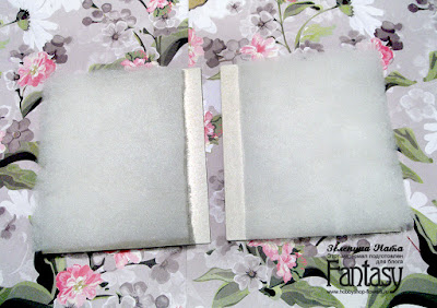 Приклеиваем два кусочка синтепона. Т.к. моя конструкция на пружинке, я оставила место для того, чтобы пробить отверстия биндером, синтепон туда не клеем. Если же делать альбомчик на кольцах, то покрываем синтепоном всю заготовку.