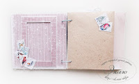 Первый разворот имеет помимо основных страниц конверт-бонус для дополнительного размещения фотографий. На левой странице расположен карман для фото. На правой - открывающийся элемент интересной конструкции, декорированный воздушной салфеткой.