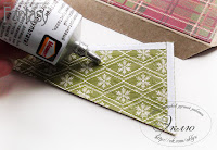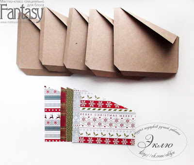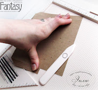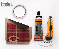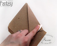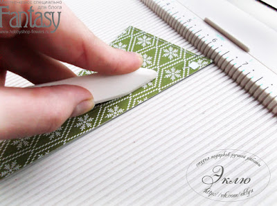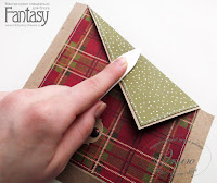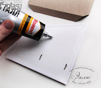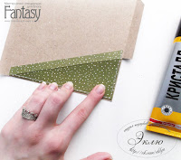 Переходим к клапанам. Проклеиваем скотчем края подложки. Промазываем клеем. Прижимаем к разогнутому клапану, а потом сгибаем и проходим биговкой, проверяя не сдвинулся ли сгиб. Ждем. Снимаем скотч. Готово!