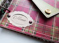 Так как мы будем декорировать карманы рамочками для надписей, которые будем крепить на брадсы, то сделаем это до того, как приклеим подложку. Проклеиваем подложку для кармана скотчем по контуру. Рамочку промазываем клеем только в нижней части(чтобы сверху можно было вставить карточку)и прижимаем к подложке. Даем немного подсохнуть и устанавливаем брадсы. Подложку промазываем клеем и прижимаем к карману. Даем клею схватиться и аккуратно снимаем скотч по краям.