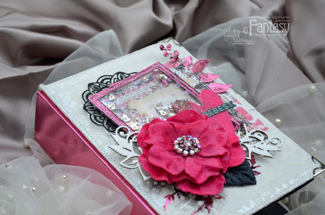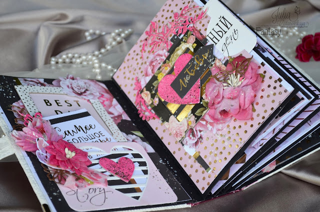 Я готова показать вам внутренние страницы, которые украшены разнообразным декором и, конечно же, любимой вырубкой из ножей и чипбордом от Fantasy.