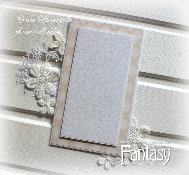 А. Сначала необходимо обклеить основу открытки с лицевой и обратной стороны скрап-бумагой.
