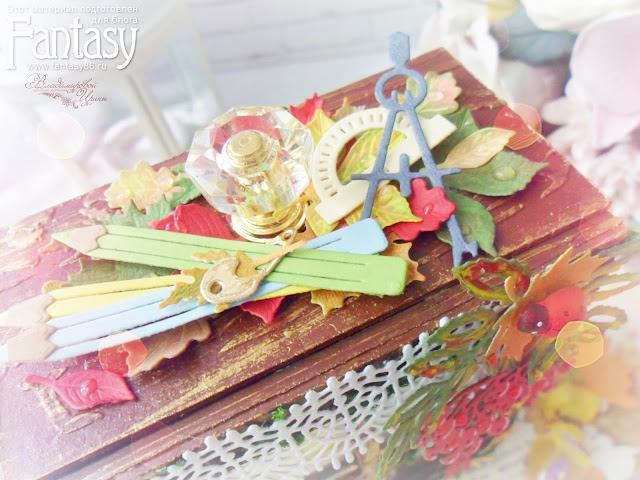 Для оформления лицевой части короба использовала вырубку, сделанную ножами Fantasy: "Рябина 1", бордюр мини "Сердечные узоры 2" и надпись "С Днем знаний!".
